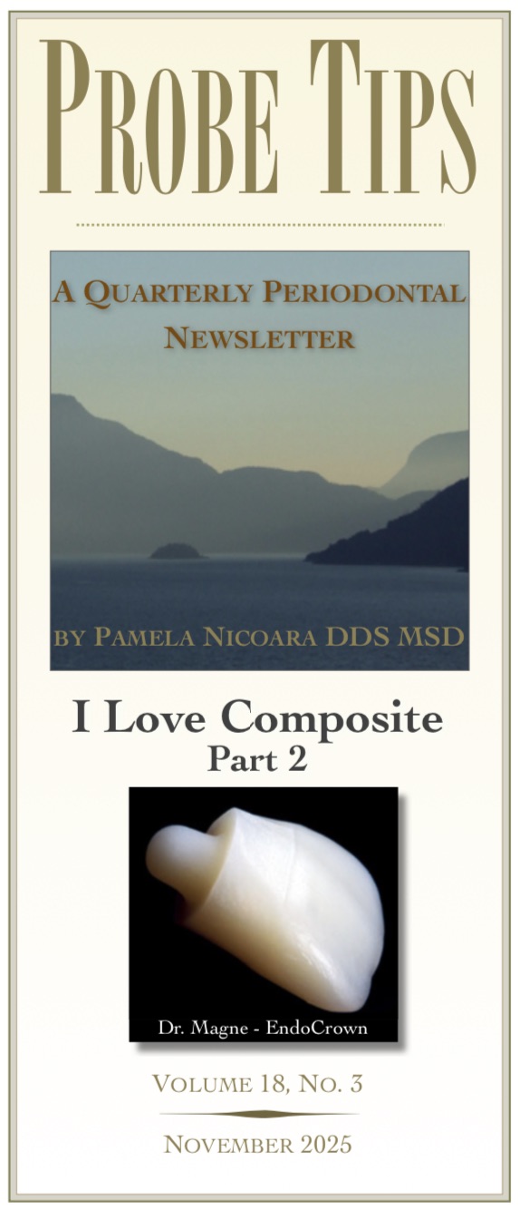 ProbeTips is a quarterly periodontal newsletter created by Dr. Nicoara for the dentists and specialists of Snohomish County. The newsletters cover relevant topics of interest to the dental and even medical community. They can also be shared with patients as a means of education and information. All photographs and cases are patients of Dr. Nicoara unless otherwise stated. The links below connect you to a PDF of the newsletter. You can contact Dr. Nicoara’s office if you would like a print out of a particular newsletter.